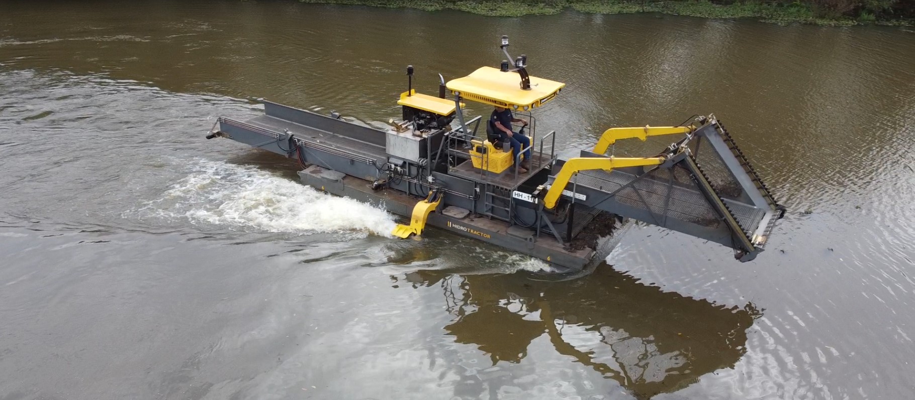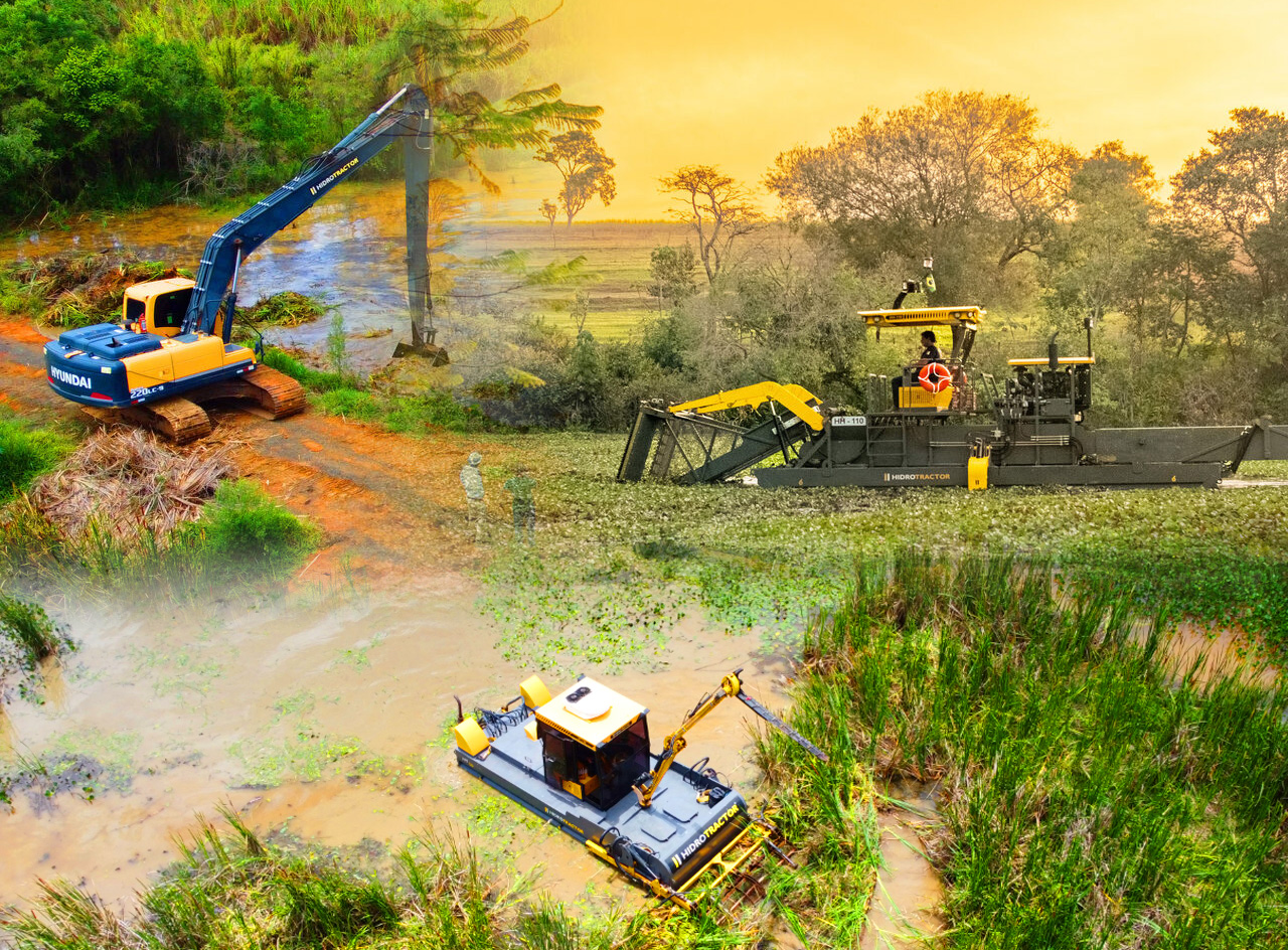 Hidrotractor possui em sua frente de trabalho uma escavadeira de longo alcance, sendo capaz de retirar plantas enraizadas e fazendo o bota fora do material entregue pelo Hidrotractor.